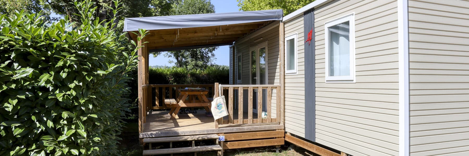 Mobil home de 2023, très confortable avec une grande terrasse couverte et sa pièce de vie spacieuse.